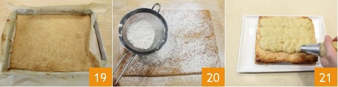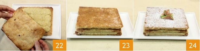 Recupere as massas folhadas e asse-as em forno ventilado a 220°C por 15 minutos, depois continue a cozedura abaixando a temperatura para 180°C por 25 minutos. Ao final desse tempo, a massa folhada deve estar dourada e não mole ao toque. Retire do forno 19 e polvilhe com açúcar de confeiteiro 20. Asse novamente, desta vez a 240°C por 3-4 minutos. A superfície deve estar dourada e brilhante. Desenforme e deixe esfriar em uma grade. Divida a massa grande ao meio, assim você deve obter 3 massas folhadas de 28x18 cm. Coloque uma massa folhada em um prato de servir, recheie com o creme de figos, ajudando-se com um saco de confeiteiro 21 e continue alternando uma camada de massa folhada, uma de creme.
