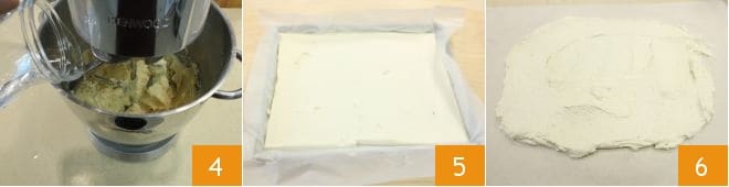 adicione a água fria 4. Continue a amassar até obter uma mistura homogênea. Espalhe 2/3 da massa em uma folha de papel manteiga, dando uma forma retangular com espessura de meio centímetro que meça cerca de 35x28 cm, transfira a massa para uma assadeira das mesmas dimensões e nivele bem a superfície com uma espátula 5. Cubra com outra folha de papel manteiga e deixe descansar na geladeira por pelo menos uma hora (ou até durante a noite). Abra a massa restante em uma folha de papel manteiga, dando-lhe uma forma retangular que meça metade da outra, ou seja, 28x18 cm, e que tenha espessura de cerca de meio centímetro 6. Cubra com uma folha de papel manteiga, transfira a massa para uma assadeira e deixe descansar junto com a outra massa por 1 hora na geladeira.