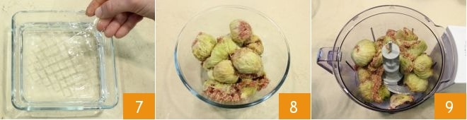 Enquanto isso, prepare o creme de figos: coloque em água fria as folhas de gelatina para amolecê-las 7, descasque os figos 8 e coloque-os em um liquidificador 9