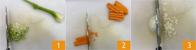 Para preparar o minestrone à genovesa, primeiro prepare o Caldo de legumes, depois cuide da limpeza dos legumes: limpe e corte em brunoise o aipo 1, a cenoura 2 e a cebola 3.