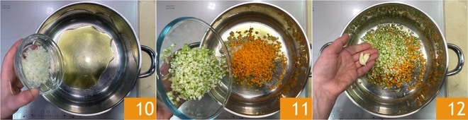 Aqueça um fio de azeite em uma panela, depois acrescente a mistura de cebola 10, cenoura e aipo 11. Adicione o dente de alho esmagado 12 e deixe refogar por alguns minutos.
