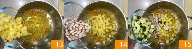 Adicione a batata 13, os feijões 14 e a abobrinha 15.