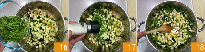 Acrescente também as vagens 16, depois adicione sal 17 e pimenta. Misture 18 e deixe refogar por mais alguns minutos.