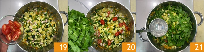 Neste ponto, adicione os tomates cereja 19 e as acelgas 20, depois cubra com o caldo de vegetais 21.