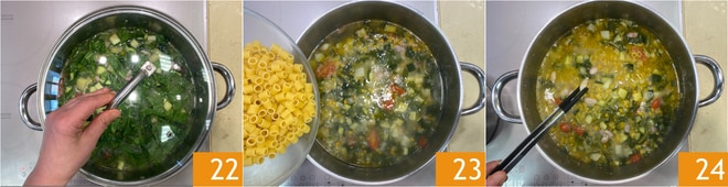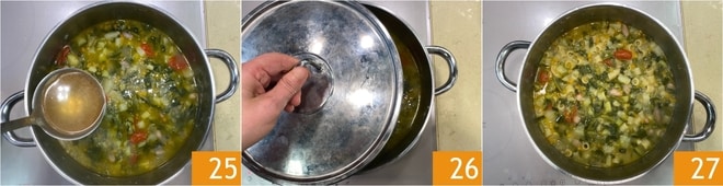 Misture e adicione mais caldo, se necessário 25, depois cubra novamente 26 até que a massa esteja cozida 27. Ajuste o sal e a pimenta, se necessário.