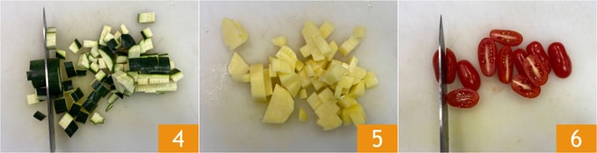 Reduza a abobrinha 4 e a batata em cubos de 1 cm 5, depois divida os tomates cereja ao meio 6.