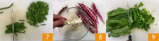 Corte as pontas e corte as vagens em losangos 7, depois desgrane os feijões frescos e coloque-os em uma tigela 8. Por fim, corte grosseiramente as acelgas em tiras 9.
