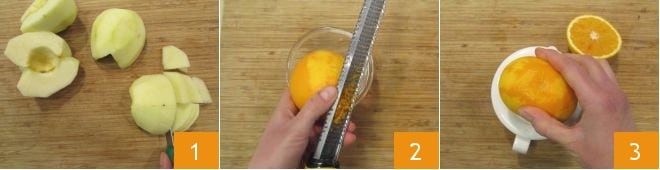 Para preparar os mini bolos sem açúcar, primeiro lave as maçãs, depois reserve metade coberta com filme plástico para a decoração final. Descasque e corte as maçãs restantes em fatias de cerca de 3 mm de espessura 1 e coloque-as em uma tigela grande. Rale a casca de uma laranja não tratada e reserve 2; depois esprema o suco desta laranja ralada e de outra 3.