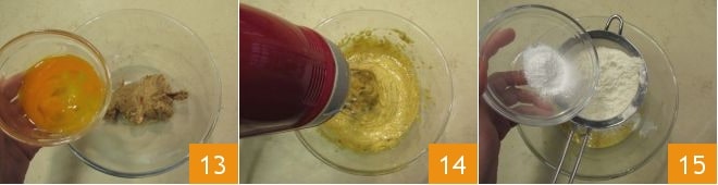 Transfira o creme obtido para uma tigela, adicione o ovo 13, uma pitada de sal e misture com a batedeira elétrica 14. Peneire a farinha e o fermento dentro da tigela 15
