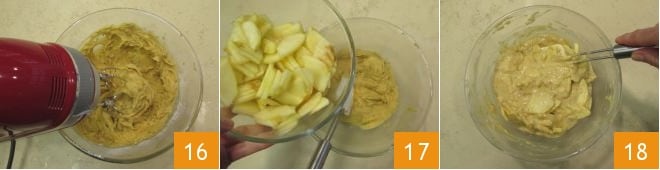 e continue misturando a massa com a batedeira elétrica para incorporar tudo 16. Neste ponto, adicione as fatias de maçã temperadas com o suco de laranja 17 e incorpore-as à massa misturando com uma espátula 18.