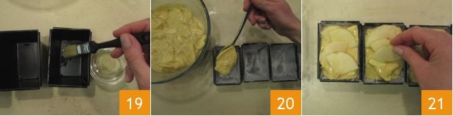 Unte 19 e enfarinhe 6 formas de mini bolo de 7x4 cm e 4,5 cm de altura, depois encha-as com a massa até 1 cm da borda 20. Decore a superfície com a metade da maçã reservada, que você terá descascado e cortado em fatias 21, e asse em forno estático pré-aquecido a 180°C por cerca de 25 minutos.