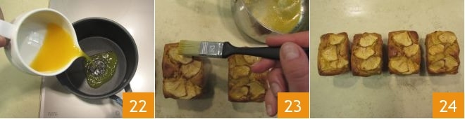 Enquanto isso, despeje em uma panela o suco de laranja que você guardou 22 e reduza em fogo médio por 2-3 minutos 22. Uma vez assados, desenforme os mini bolos e deixe esfriar, em seguida, retire-os da forma e pincele-os com a redução de suco de laranja 23. Seus mini bolos sem açúcar estão prontos para serem saboreados 24!