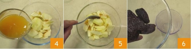 Do suco de laranja espremido, use 100 g para a preparação da massa, despejando-o na tigela com as fatias de maçã 4 e reserve o restante do suco: ele servirá para pincelar os bolos uma vez assados. Misture bem as maçãs com o suco de laranja 5 e reserve. Coloque as tâmaras sem caroço em um recipiente alto e estreito 6,