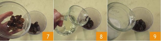 adicione as passas lavadas previamente 7, o óleo de sementes 8, o leite 9
