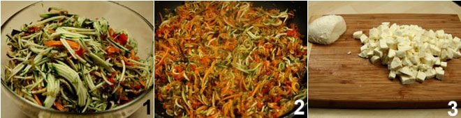 Primeiro, prepare a massa para a pizza com as quantidades indicadas acima e seguindo o procedimento que você encontra Massa de pizza Deixe-a descansar em um lugar morno e seco por cerca de 2 horas, até que a massa tenha dobrado de volume. Quando a massa estiver crescida, comece a preparar o recheio de legumes lavando e cortando finamente (em julienne) várias variedades de legumes, nós usamos abobrinhas, berinjelas, cenouras e pimentões 1. Coloque-os em uma panela com uma colher de óleo e refogue por alguns minutos em fogo alto, adicione sal e pimenta 2. Corte a mozzarella em cubos 3 e coloque-a em uma peneira para retirar o excesso de água.