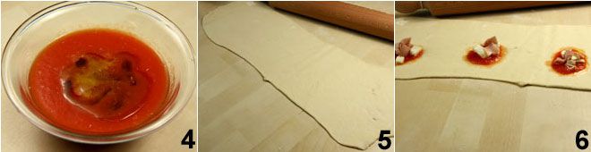 Para o recheio clássico, tempere 100 ml de molho de tomate com óleo e sal 4, corte a mozzarella em cubos, escorra bem, e o presunto cozido em pedaços pequenos. Estenda a massa em uma superfície em retângulos de aproximadamente 18 cm de largura e 2 mm de espessura 5, disponha o recheio em pequenos montes 6 no centro do retângulo (com as quantidades da receita resultarão em 10 mini calzones de tomate, mozzarella e presunto, e 10 de legumes e mozzarella),