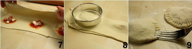 levante a massa de um lado e cubra o recheio sobrepondo-a no outro lado 7. Com a ajuda de um cortador de massa com diâmetro de 10 cm ou com um copo, corte os calzones em formato de meia-lua 8 e com as extremidades de um garfo faça pressão na borda para selar 9. Pincele levemente com óleo os minicazlones e leve ao forno ventilado a 230°C por 10/15 minutos. Os minicazlones assados devem ser servidos quentes, mas cuidado para não se queimar com o recheio!