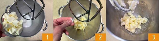 Para preparar as mini cassatas assadas, comece pela massa: na tigela da batedeira planetária, equipada com o gancho de folha, coloque o açúcar, a manteiga cortada em cubos (retirada da geladeira 5 minutos antes)1 e uma pitada de sal 2. Misture por alguns instantes para amalgamar 3.