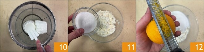 Dedique-se agora ao recheio: escorra bem a ricota, depois peneire-a em uma tigela 10. Adicione o açúcar 11 e as raspas de laranja 12.