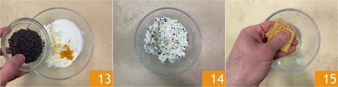 Despeje as gotas de chocolate amargo 13 e continue a mexer até obter um creme uniforme 14. Coloque a mistura na geladeira até o momento de usar. Enquanto isso, esmigalhe grosseiramente os biscoitos secos 15.