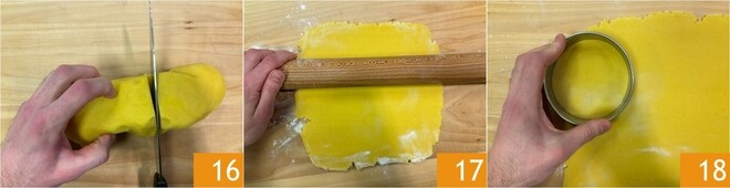 Recupere a massa da geladeira, pegue 2/3 16 e abra a massa com um rolo até uma espessura de 4mm 17. Corte 12 discos com um cortador de massa com cerca de 12 cm de diâmetro 18.