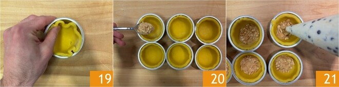 Unte e enfarinhe 12 forminhas com 8 cm de diâmetro e forre-as com os discos de massa 19. Reserve na geladeira as sobras e um pouco de massa para fazer as tampas. Despeje metade dos biscoitos secos no fundo 20. Pegue o recheio e transfira-o para um saco de confeitar sem bico, depois despeje dentro das forminhas até quase o topo 21 e nivele bem com uma espátula.