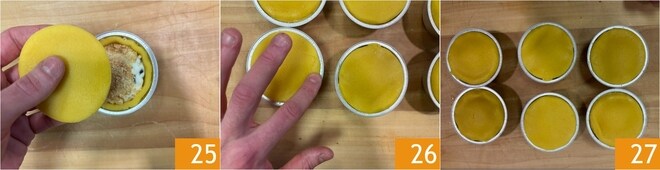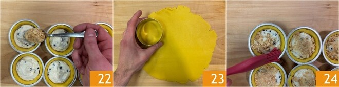Coloque por cima os disquinhos de massa 25 e sele bem as bordas pressionando levemente 26. Antes de assar, ou após cerca de 10 minutos de cozimento, fure a superfície com um palito de dente para permitir a saída do vapor. Asse as mini cassatas em forno estático pré-aquecido a 175-180°C por cerca de 35-40 minutos, colocando-as na primeira prateleira inferior 27.