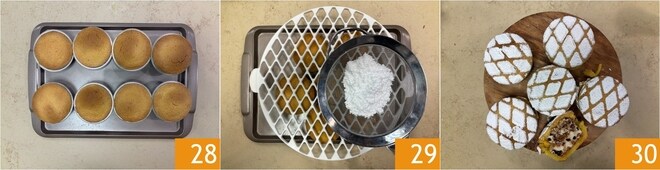 Uma vez assadas 28, deixe esfriar completamente dentro da forma. Finalmente, vire os docinhos em uma bandeja de servir, polvilhe com açúcar de confeiteiro 29 e, se tiver uma grade para tortas, use-a como estêncil para obter uma decoração elegante. Nesse ponto, suas mini cassatas assadas estão prontas para serem servidas 30.