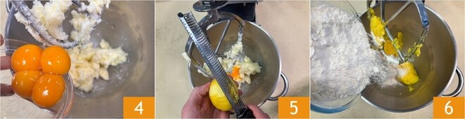 Em seguida, adicione as gemas 4 e as raspas de limão 5. Ligue a batedeira para misturar. Por fim, adicione a farinha 6.