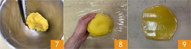 Sove até obter uma massa compacta e homogênea 7. Forme uma bola achatada 8, envolva-a em filme plástico 9 e deixe descansar na geladeira por pelo menos 3 horas.