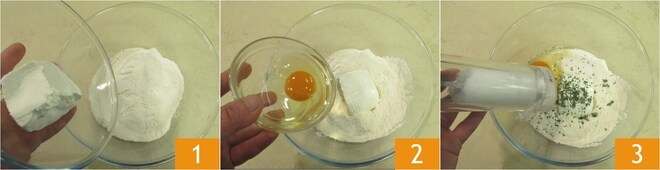Para preparar as mini cheesecakes salgadas com cebolas, primeiro prepare a massa para a base: em uma tigela, coloque a farinha e a ricota 1, depois adicione o ovo 2, algumas folhas de tomilho, sal 3 e pimenta.