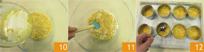 Coloque as migalhas de massa em uma tigela e adicione a manteiga derretida levemente fria 10, depois misture com uma colher ou uma espátula para combinar o composto 11. Agora forre 8 aros de metal com papel acetato e coloque-os em uma bandeja com papel manteiga. Distribua a mistura de massa dentro dos aros e nivele pressionando com as costas de uma colher de chá 12. Deixe esfriar as bases na geladeira por cerca de 30 minutos.