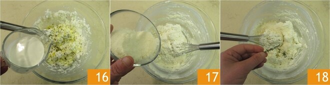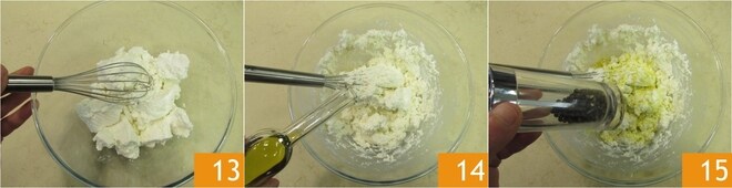 Enquanto isso, prepare o creme de ricota: coloque a ricota em uma tigela e amoleça com um batedor de mão 13, depois adicione o azeite 14, o sal e a pimenta 15.