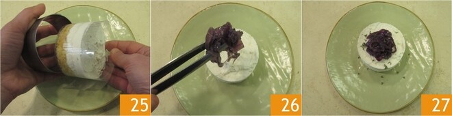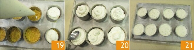 Retire as bases da geladeira e distribua o creme nos aros 19, nivelando a superfície com as costas de uma colher de chá 20. Deixe firmar na geladeira por pelo menos 2 horas 21, cobertas com filme plástico.