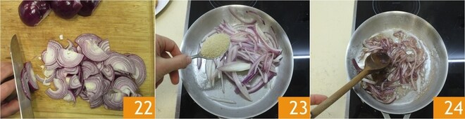 Enquanto isso, prepare as cebolas caramelizadas: descasque e corte as cebolas roxas em fatias finas 22. Cozinhe as cebolas em uma frigideira com um fio de azeite em fogo médio-baixo por cerca de 5-7 minutos, depois adicione o açúcar mascavo 23 e a água e continue cozinhando por mais 5-6 minutos. Uma vez caramelizadas 24, deixe esfriar.