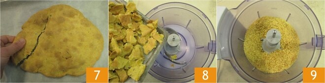 Enquanto isso, derreta a manteiga em uma panelinha e reserve. Após o tempo de cozimento da massa, retire do forno e deixe esfriar. Quebre grosseiramente a massa 7 e transfira para um processador 8, depois triture até obter migalhas 9.