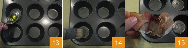 Unte com óleo de oliva uma forma de 24 mini muffins (uma de 12 mini muffins também serve, você pode preparar uma segunda fornada depois) 13, pincele cuidadosamente 14, pegue as fatias de speck e divida-as ao meio para forrar cada cavidade com metade de uma fatia 15; esprema a massa dentro de cada espaço até 3/4 15.
