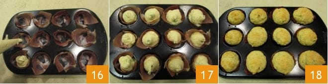 esprema a massa dentro de cada espaço até 3/4 16. Uma vez preenchida a forma 17, asse os mini muffins em forno estático pré-aquecido a 180°C por 25 minutos (antes de retirar, verifique se estão bem dourados na superfície). No final do cozimento, retire os mini muffins salgados de ricota e speck do forno e deixe esfriar um pouco antes de servir 18.