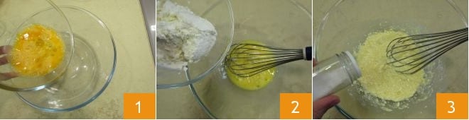 Para preparar os mini muffins salgados de ricota e speck, coloque em uma tigela os dois ovos levemente batidos 1, adicione a ricota de vaca bem escorrida do soro 2 e incorpore-a mexendo com um batedor de mão, depois adicione um pouco de sal 3;