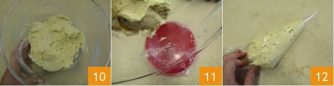 Misture bem a massa 10. Uma vez pronta, transfira a massa para dentro de um saco de confeitar descartável (11-12).