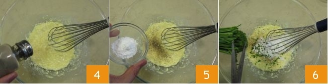 aromatize com pimenta moída 4 e adicione o fermento em pó para preparações salgadas 5. Aromatize a massa com cebolinha, cortando a parte mais verde dos talos com uma tesoura 6.