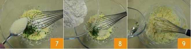 Agora incorpore também o Grana ralado 7 e, aos poucos, adicione a farinha alternando com o óleo de sementes (8-9).
