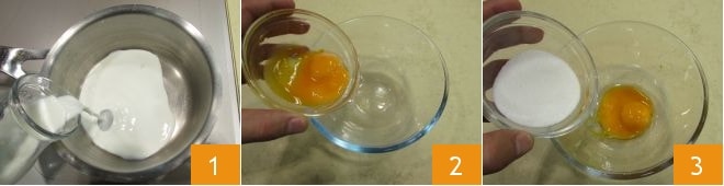 Para preparar os mini Paris-Brest de cacau e creme de chocolate comece pelo creme: despeje o leite em uma panela 1 e leve à fervura, depois desligue o fogo. Em uma tigela à parte, coloque as gemas 2 e o açúcar de confeiteiro 3,