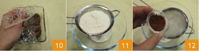 cubra com filme plástico em contato 10, deixe esfriar e depois leve à geladeira para firmar. Passe a preparar a massa choux: peneire em uma tigela a farinha 11 e o cacau em pó 12.
