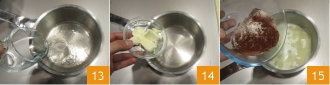 Em uma panela, despeje a água 13 e leve à fervura em fogo baixo, adicione a manteiga em pedaços 14, as misturas secas 15