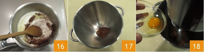 misture delicadamente com uma colher de pau 16 até formar uma película no fundo e uma massa lisa e firme que se desprende das laterais. Transfira a massa obtida para uma batedeira equipada com a pá 17, ligue a máquina e incorpore um ovo de cada vez 18, aguardando para adicionar o próximo se o anterior não tiver sido absorvido.