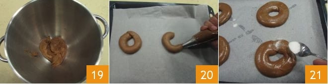 Continue a trabalhar até que a massa esteja firme e estável 19. Transfira a massa choux para um saco de confeitar com bico liso de 1,5 ou 2 cm de diâmetro, esprema a massa sobre uma assadeira forrada com papel manteiga para formar 4 anéis de 8-9 cm de diâmetro 20. Polvilhe os anéis com o açúcar granulado 21