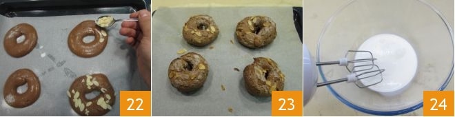 e algumas lâminas de amêndoas 22. Asse os mini Paris-Brest em forno pré-aquecido a 190° em modo ventilado por 35 minutos, mantendo o forno fechado nos primeiros 5 minutos e nos 30 minutos seguintes "entreaberto", ou seja, com a porta levemente aberta para liberar a umidade. Uma vez assados, retire do forno 23 e deixe esfriar. Enquanto isso, pegue o creme de chocolate, à parte despeje o creme de leite fresco em uma tigela 24