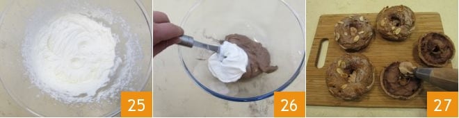bata com o batedor 25, depois adicione o chantilly ao creme de chocolate 26, mexendo de cima para baixo para não desmontar. Transfira o creme obtido para um saco de confeitar com bico de estrela. Corte ao meio os mini Paris-Brest, recheie-os com o creme de chocolate 27. Seus deliciosos mini Paris-Brest estão prontos para serem saboreados.
