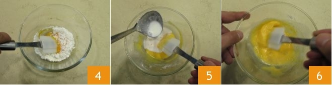 misture com um batedor e depois adicione também o amido de milho peneirado 4 e mexa para integrar a mistura. Adicione algumas colheres de sopa de leite quente à mistura 5 para diluir 6